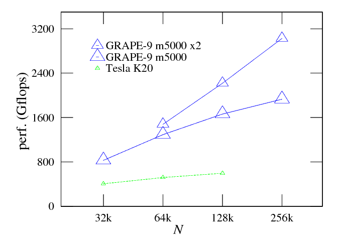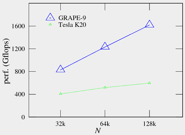 GRAPE-9 model5000 の性能を測定しました (直接法、individual timestep, eps=0.0, eta=0.01)。 比較のため NVIDIA 社 の GPU (Tesla K20) での性能も記載してあります。