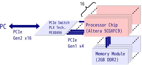 - パイプライン回路は 16 個のプロセッサチップ (Altera 社製 FPGA) に集積されており、